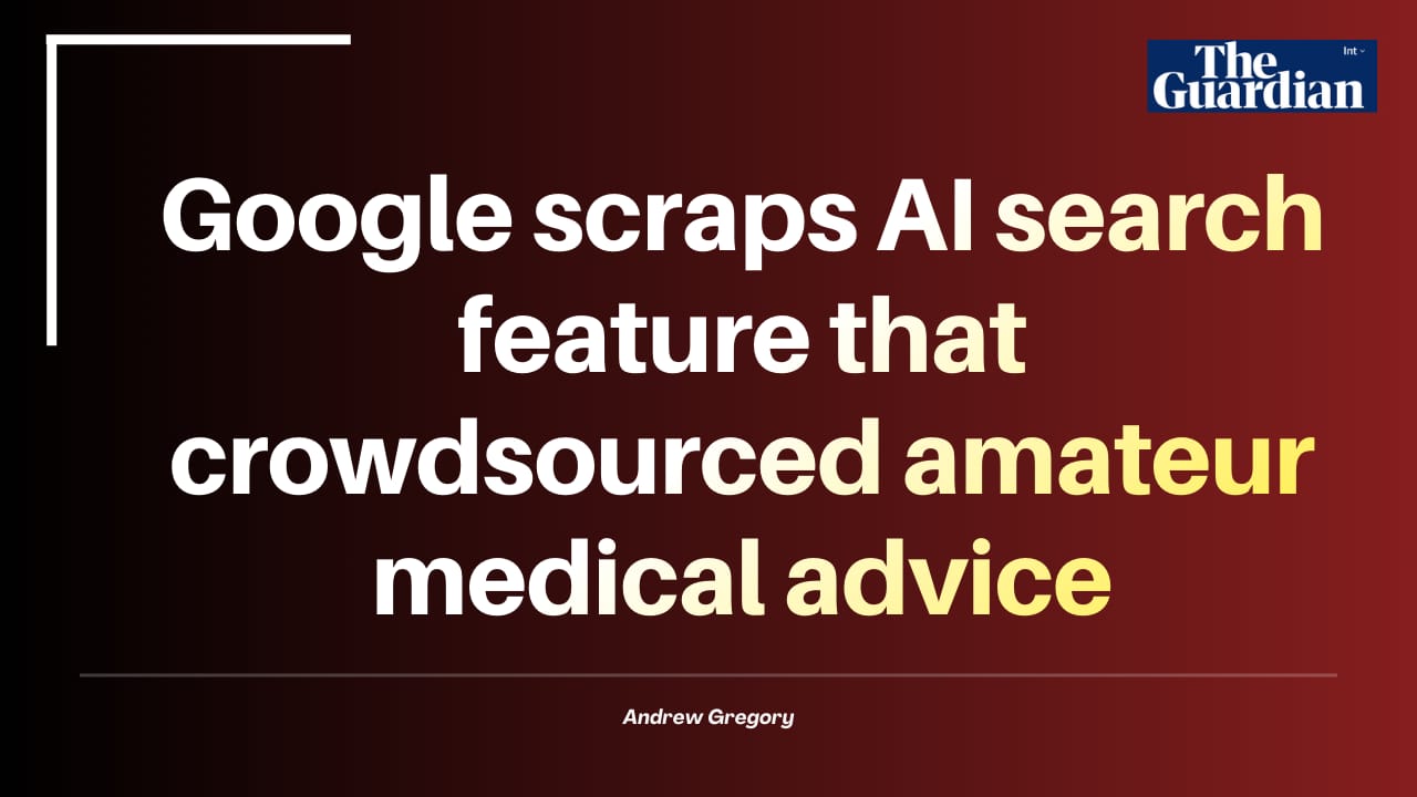 Find out more about it here: https://www.theguardian.com/technology/2026/mar/16/google-scraps-ai-search-feature-that-crowdsourced-amateur-medical-advice?utm_source=chatgpt.com